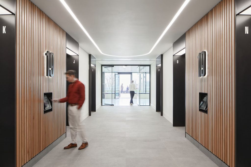 The new building features a double-height entrance and lobby on Ropemaker Street, and a separate entrance for bicycles to encourage occupants to ride to work.